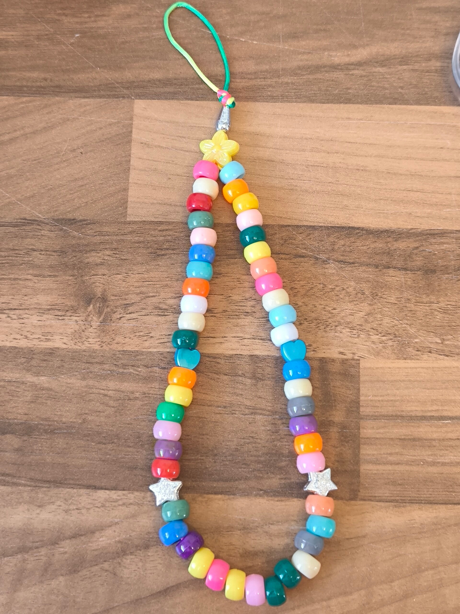 Die Kombination aus kräftigen und pastelligen Perlen macht sie zu einem echten Hingucker, während zwei glitzernde Sternperlen und ein kleiner gelber Blütenanhänger am oberen Ende für verspielte Details sorgen. Dank des stabilen Gummibands ist sie leicht und angenehm zu tragen – und sorgt dafür, dass dein Handy immer sicher griffbereit ist.